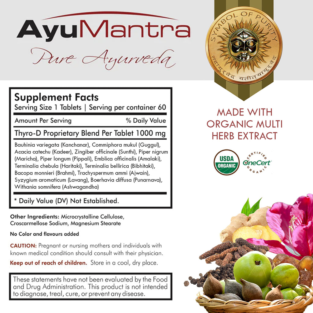 The metabolism and thyroid function are regulated by thyro-D. In general, Ayurveda views impaired metabolism as the root of the majority of illnesses. Thyro D by Ayumantra is a combination of historically validated herbs that detoxify the body and enhance overall metabolic health.