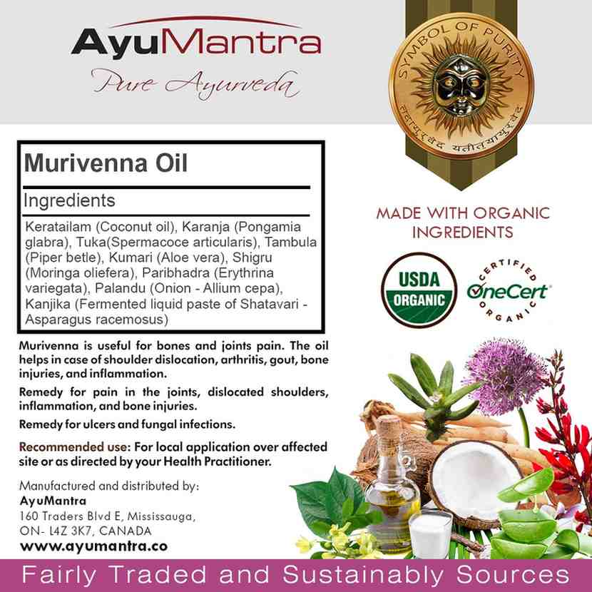 Murievenna is formulated with herbs containing healing properties in conditions ranging from simple joint swellings and pain to ACL ligament tears. Prepared with a base of coconut oil, Murivenna has antiseptic properties that can be used to treat skin diseases, wounds, and ulcers. Ayurvedic doctors in India have also been using the medication for foot ulcers and non-healing ulcers. In case of redness on the skin and irritations due to injuries and joint problems Murivenna oil can prove to be quite effective.