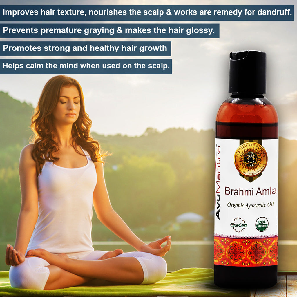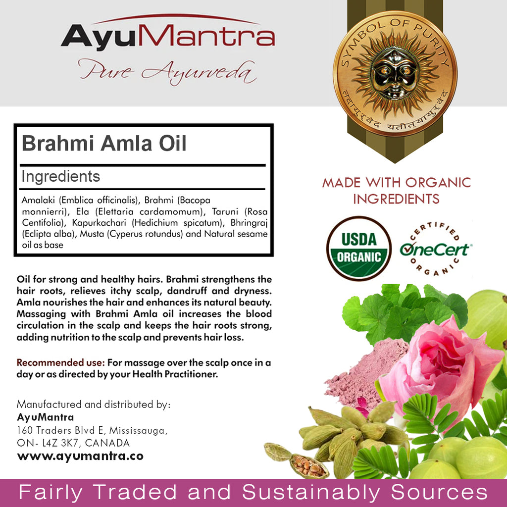 Brahmi Amla nourishes and rejuvenates hair. It helps reduce dandruff by entering the head through the pores on the scalp and consecutively relaxes the mind. Amla is being used for hair problems for centuries, in India. Apart from making the hair look nourished and glossy its properties of preventing premature graying is one of the main reasons for its popularity as a dependable hair remedy.