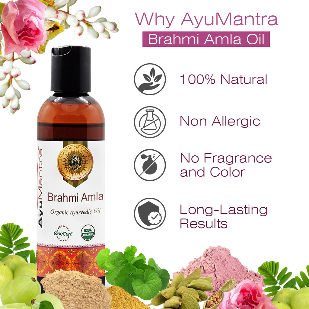 Brahmi Amla oil from AyuMantra brings to you the perfect blend of the ancient remedies for hair, Brahmi, and Amla. The hair oil soothes the mind, nourishes the scalp, fights dandruff at the same time has an anti-inflammatory effect on the scalp.