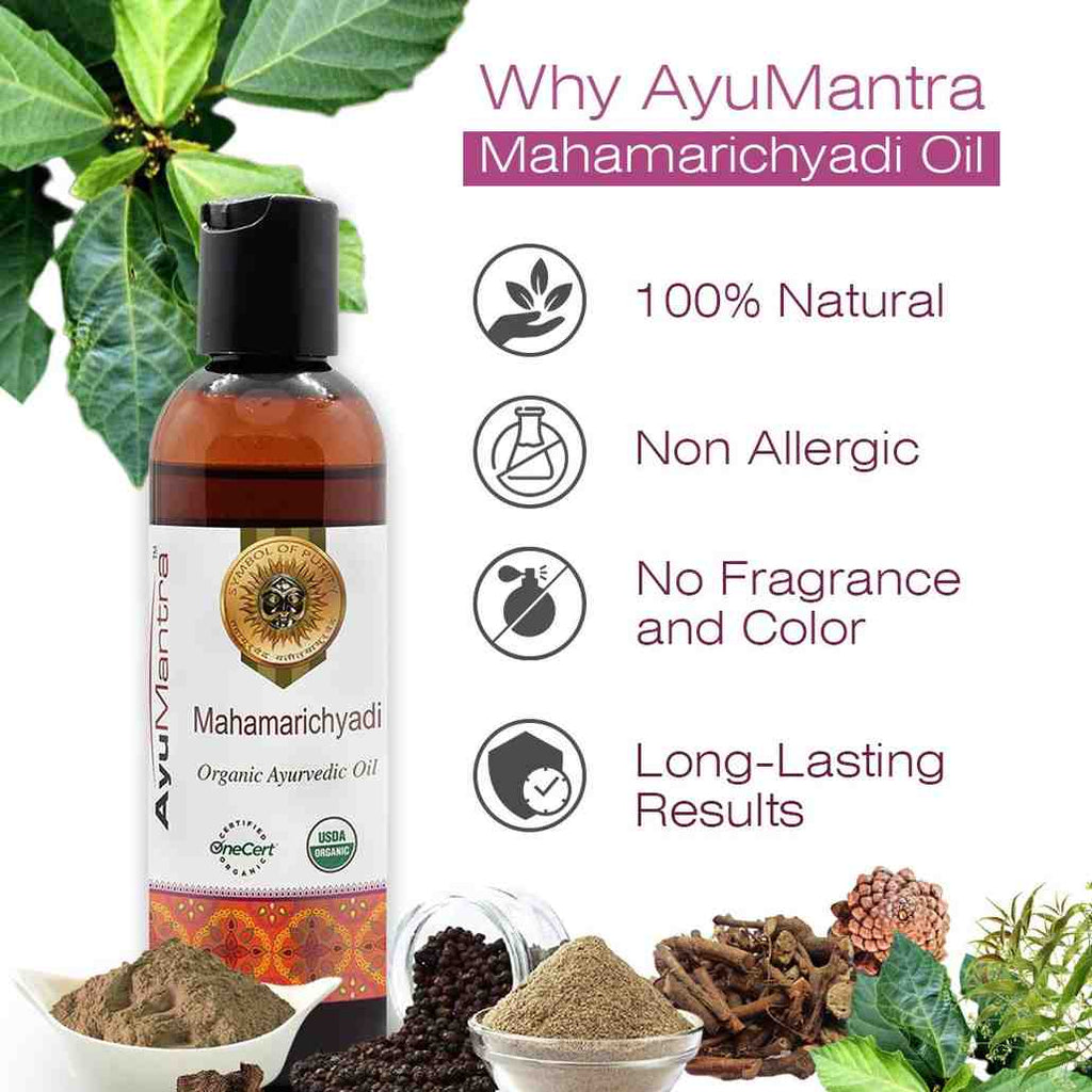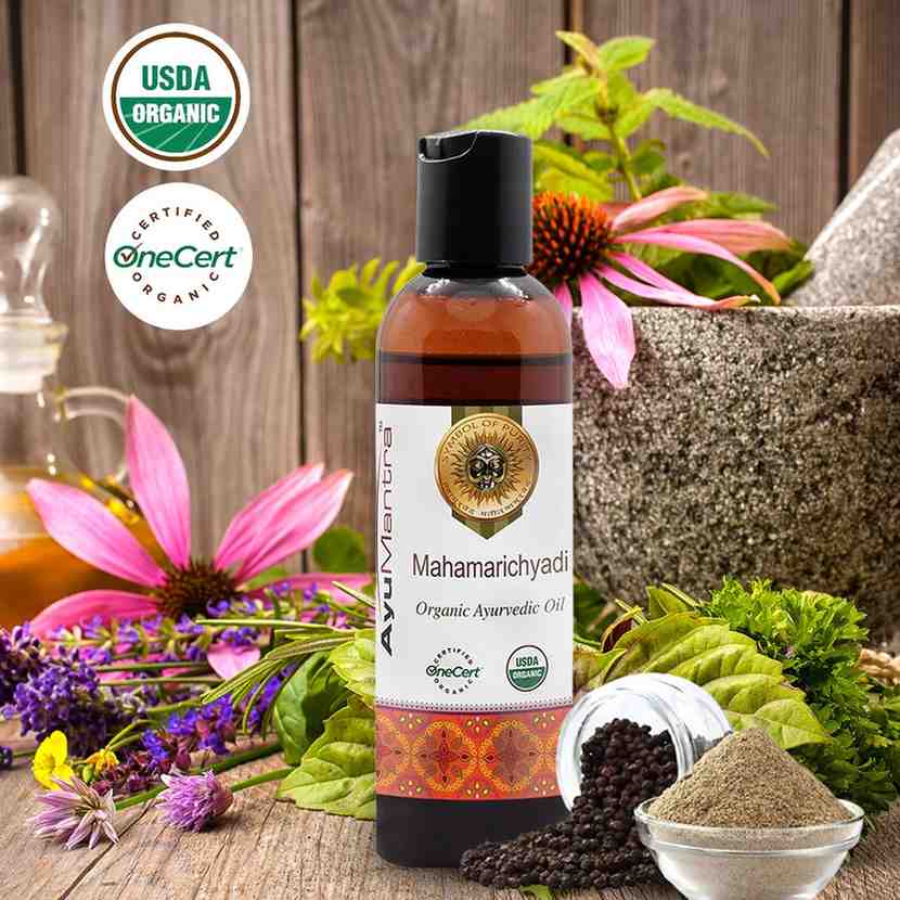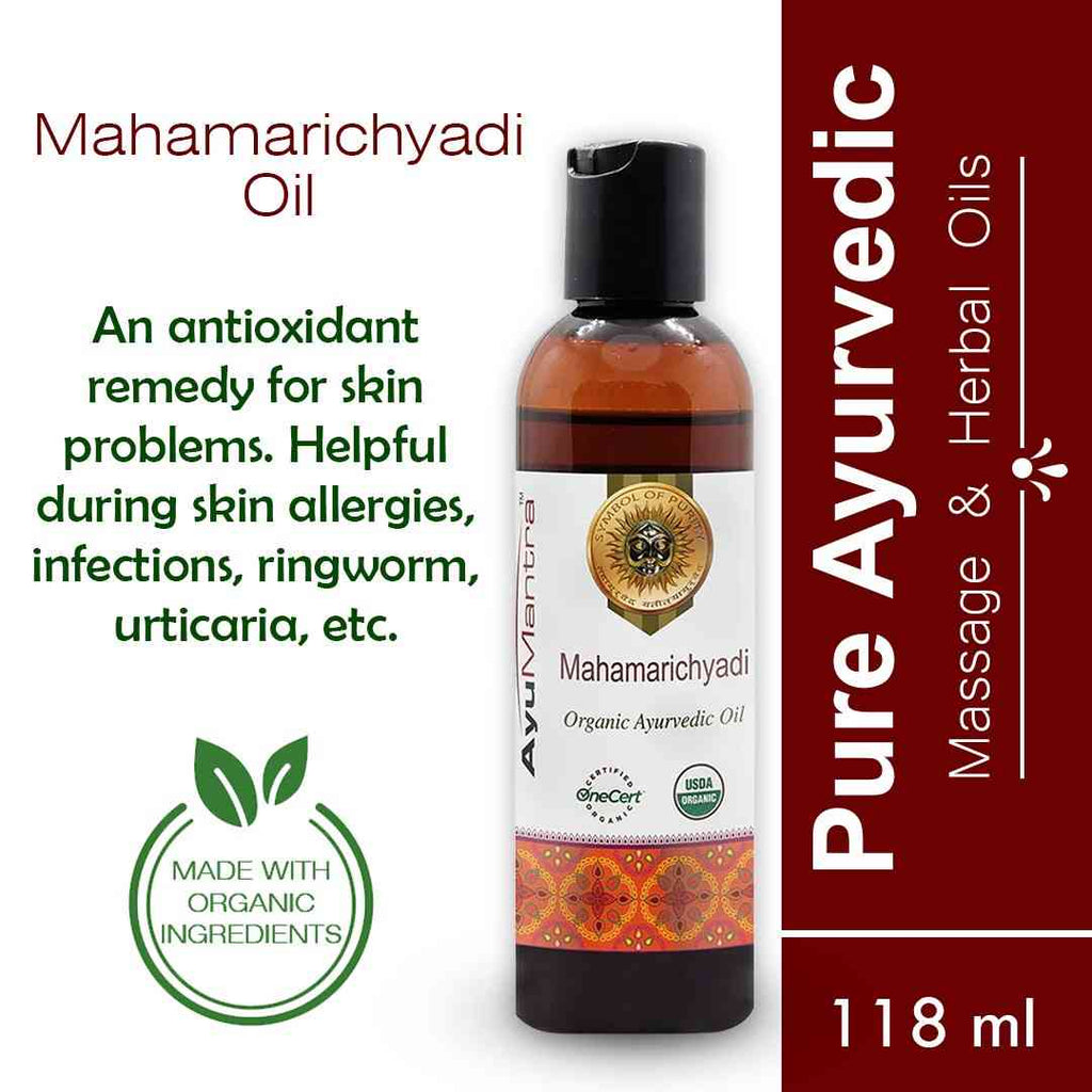 Mahamarichyadi oil is an antioxidant remedy for skin problems. Helpful during skin allergies, infections, ringworm, and urticaria. Mahamarichyadi oil has many antiseptic and anti-fungal properties which strongly work as an antioxidant in the body. It is perfect to heal wounds caused by infections and allergies. It is also used on the scalp as a remedy for eczema and dandruff. It can be used for mild and chronic skin problems as its anti-inflammatory effect soothe the skin and help in healing it.