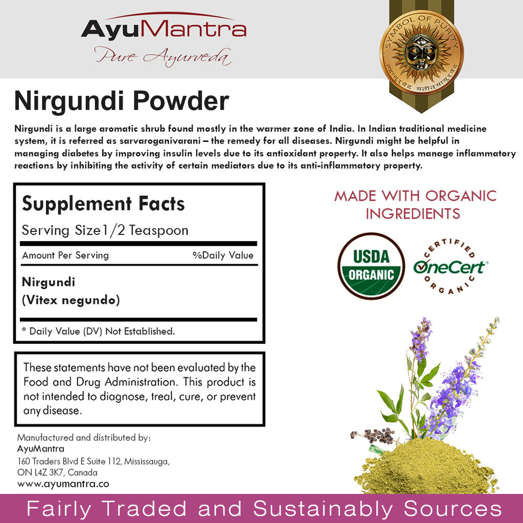 Nirgundi powder is a potent herb possessing multiple therapeutic uses. It promotes healthy joints as it encourages blood circulation in the joints and supports the natural lubrication, and strengthens the muscles for easy mobility and flexibility. It promotes menstrual health in women and improves skin and hair health as well. Antioxidant and anti-inflammatory traits are present in nirgundi.