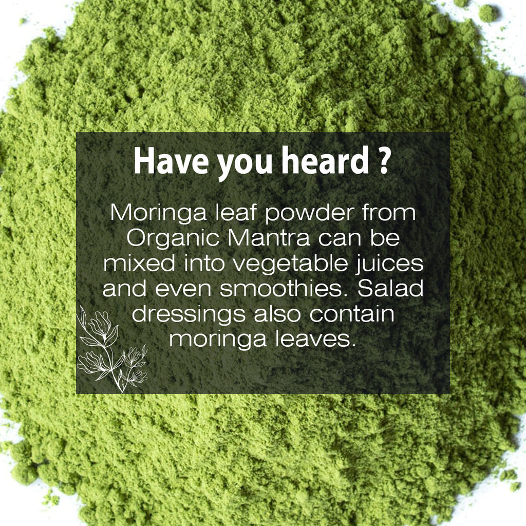 Moringa leaf powder from Organic Mantra can be mixed into vegetable juices and even smoothies. Salad dressings also contain moringa leaves.