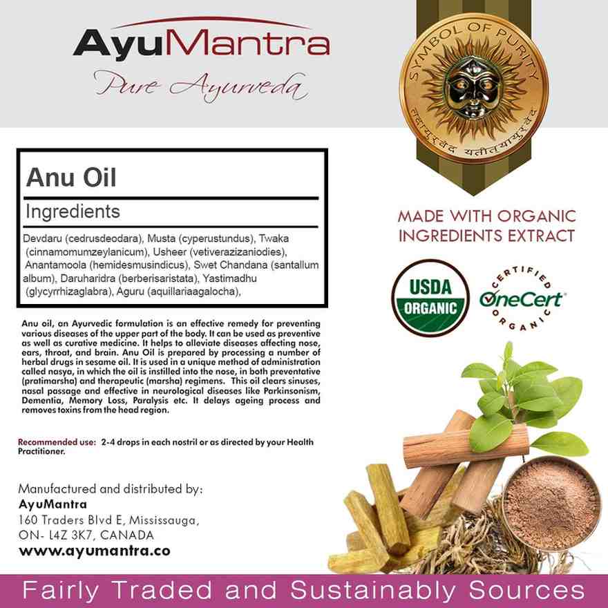 Elimina los problemas que afectan a los órganos de los sentidos, especialmente la nariz, la cabeza y el cerebro. El aceite Anu es una fórmula perfecta para la salud de los órganos de los sentidos y el cabello. Cualquier obstrucción en las vías nasales puede afectar enormemente nuestra tranquilidad y concentración, ya que la nariz tiene una conexión directa con el cerebro. Este aceite se utiliza principalmente para facilitar la respiración. También conocido como aceite Nasya, ayuda a mantener la salud del tejido nasal.