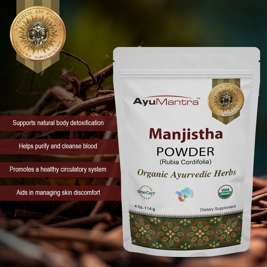 Populairement connu sous le nom de Rubia Cordifolia, est un remède à base de plantes détoxifiant pour le corps. Il purifie le sang et améliore efficacement le système circulatoire. C'est un remède recommandé pour les problèmes de peau et les déficits immunitaires. C'est une poudre végétale importante utilisée lors du traitement ayurvédique des problèmes lymphatiques. Manjistha favorise la bonne circulation du sang et de l’urine dans le corps. Il aide à réduire l’excès de chaleur et résout les problèmes de peau. La poudre de Manjistha aide à renforcer les reins et le foie. C'est un nettoyant connu du sang et aide en cas d'allergies cutanées et d'éruptions cutanées, réduit l'acné et soulage les impuretés internes.