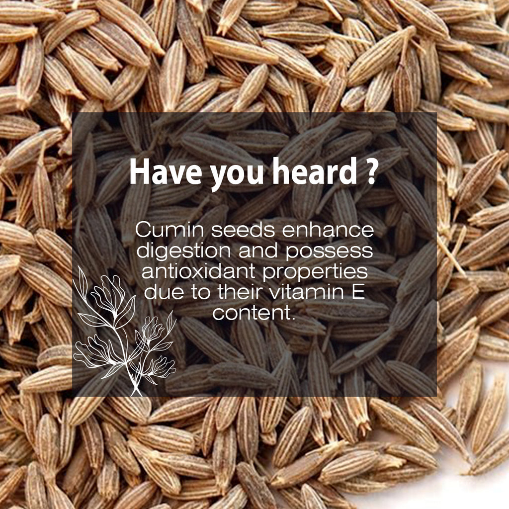 Cumin seeds enhance digestion and possess antioxidant properties due to their vitamin E content.