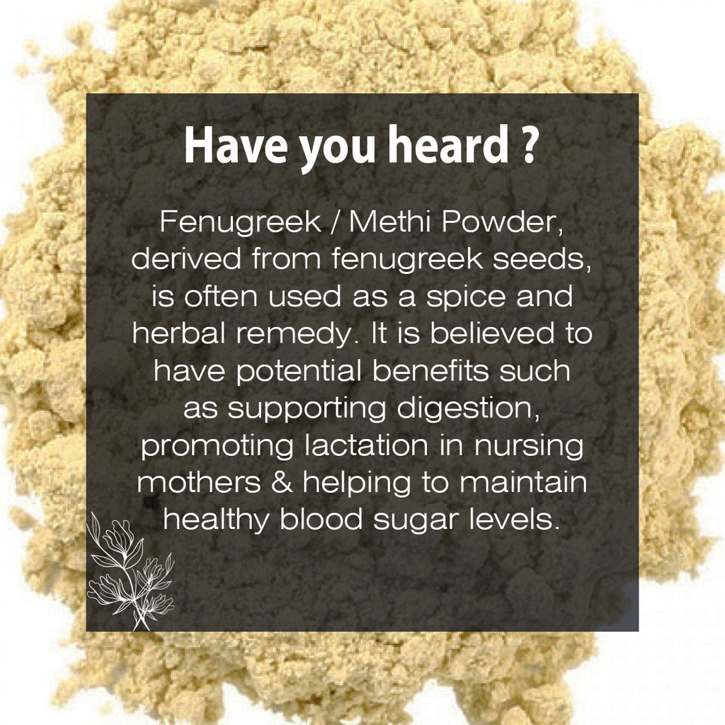 Fenugreek/methi powder, derived from fenugreek seeds, is often used as a spice and herbal remedy. It is believed to have potential benefits such as supporting digestion, promoting lactation in nursing mothers, and helping to maintain healthy blood sugar levels.