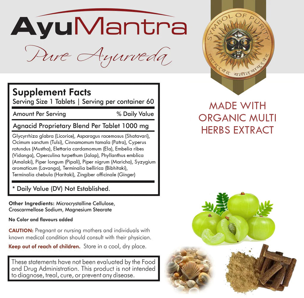 Agnacid, by the virtue of its effective ingredients, balances tridoshas, aids detoxification of the gut. It is a genuine Anti-Ama Formulation from Ayumantra’s treasure, because of its incredibly effective combination of super efficient formulations like Laghu Sut Shekhar ras, Kam Dudha ras and anti-Pitta due to best chosen herbs like Glycyrrhiza glabra (Mulethi), Embelica officinalis (Amla), Avipattikar Churna.