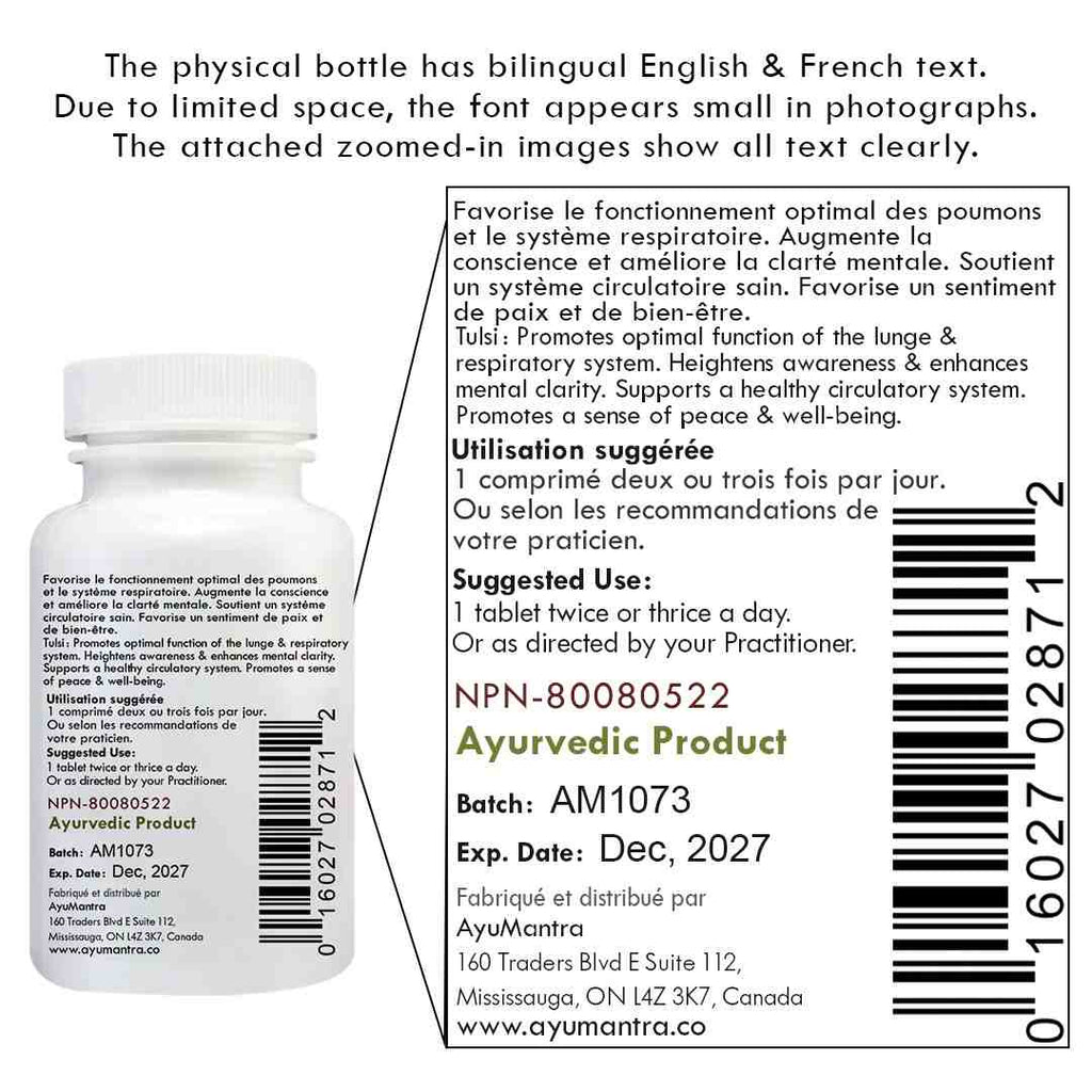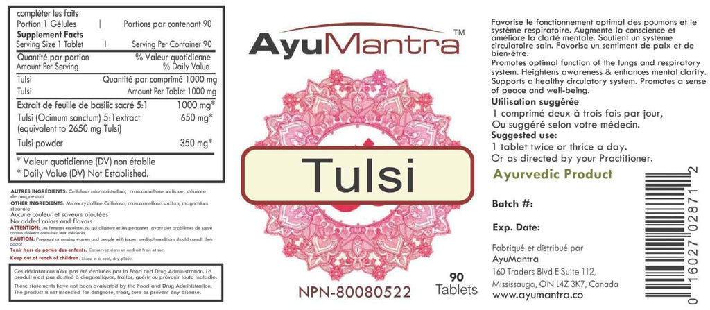 A tulsi, também conhecida como "manjericão sagrado", é uma das plantas mais sagradas da Índia e é frequentemente cultivada em pátios e casas por sua influência purificadora e benéfica no ambiente. Ela remove o excesso de kapha dos pulmões e do trato respiratório superior, promovendo uma respiração clara e confortável. A tulsi promove uma circulação saudável e traz calor e nutrição para a cavidade torácica, incluindo os pulmões e o coração. De natureza altamente sátvica, a tulsi aumenta a consciência e promove a clareza mental. É especialmente calmante para vata e kapha e, em momentos de estresse, esses suplementos de manjericão sagrado podem ajudar a proporcionar uma sensação de calma e bem-estar a uma mente hiperativa.